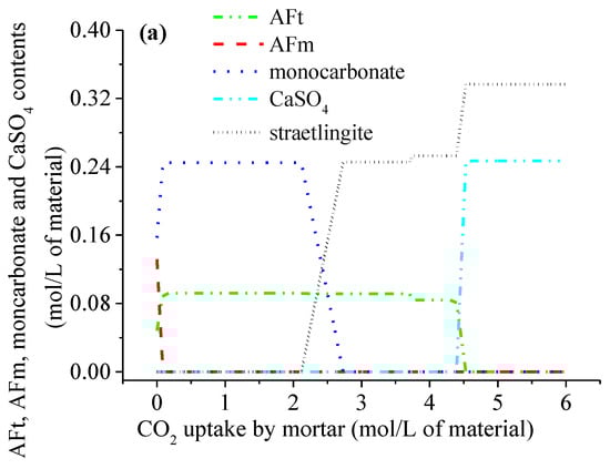 When mortar is exposed to natural carbonation (i.e., the CO2 volume concentration is 3.8 × 10−4), the phase assemblages as a function of the CO2 amount are predicted using the thermodynamic model, as illustrated in Figure 5. When the CO2 amount increases, the AFm and CH phases are carbonated first, followed by the C-S-H and AFt phases, which is similar to the results from the different CO2 concentrations. The AFm carbonation improves the AFt and monocarbonate contents (Figure 5a). The carbonation of the C-S-H lowers its Ca/Si ratio (Figure 5c), leads to the formation of strätlingite (Figure 5a) and improves the content of CaCO3 (Figure 5b), and the monocarbonate is carbonated along with the C-S-H. Shi et al. [26] has also reported similar results. Furthermore, the simulation results shown in Figure 5 indicate that the phase assemblages in the cement paste after being completely air-carbonated, primarily consist of a low-Ca/Si ratio C-S-H, strätlingite, CaCO3 and CaSO4.