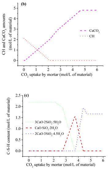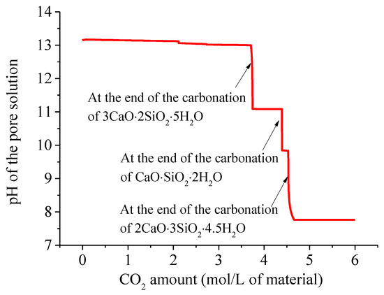 The thermodynamic model predicts the pH in a pore solution of the air-carbonated mortar as a function of the CO2 amount, as illustrated in Figure 6. With an increase in the CO2 amount, the pH has a significant decrease only when a higher Ca/Si ratio C-S-H phase is completely decalcified into a lower Ca/Si ratio C-S-H phase. However, it displayed little change during the carbonation process of each phase. There are three total significant decreases, and the first decrease (to pH = 11.08) occurs after the complete carbonation of 3CaO⋅2SiO2⋅5H2O, and the second decrease (to pH = 9.84) occurs after the complete carbonation of CaO⋅SiO2⋅2H2O, and the third decrease (to pH = 7.77) occurs after the complete carbonation of 2CaO⋅3SiO2⋅4.5H2O.