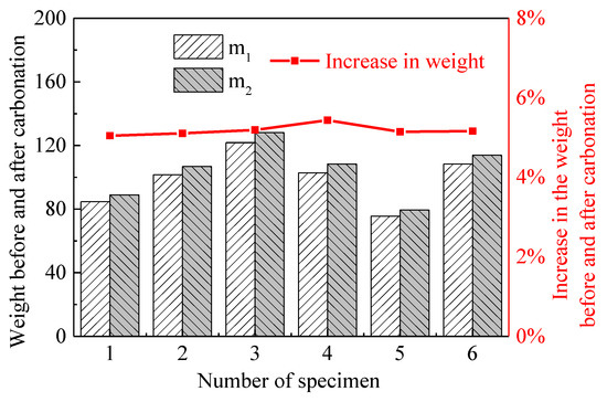 where w is the increase in the weights of the mortar before and after carbonation; (m1 and m2 are the weights of the fully dried specimens before and after the carbonation, respectively, which can be also seen in Figure 1); θm is the density of the mortar, and the value was 2.685 kg/L; and MCO2 and MH2O are the molar masses of CO2 and H2O, respectively.