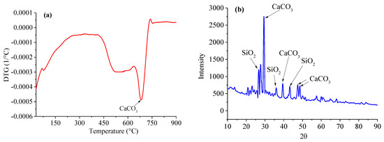 (a) DTG curves and (b) the XRD patterns of the carbonated mortar sample.