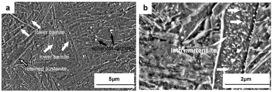 Lath martensite is mainly formed after quenching in the Dievar steel because of the comparatively low carbon content (0.39 wt %). It has been found that the quenching speed of oil should be higher than 10 °C/s to avoid entering into the bainitic transition phase zone, based on the calculation of the CCT curve. Lower levels of bainite can still be still observed in Figure 1a, probably due to the large sample size (130 × 40 × 30 mm) and the lower cooling rate. The cooling rate is estimated to be lower than 8 °C/s [34] for the temperature region of 300~350 °C with oil-quenching. A small amount of retained austenite has also been observed. In addition, lenticular martensite has been observed in the quenched Dievar steel as well (Figure 2d). Steels with a carbon content of 0.3~1.0 wt % usually contain two kinds of martensite at the same time (lath martensite and lenticular martensite) and the carbon content of this steel at a temperature of 1030 °C in the matrix is predicted to be 0.368 wt %. The addition of the alloying elements Cr, Mo, and Mn also increases the tendency to form lenticular martensite [35]. Two types of carbides are observed in Dievar steel after quenching: spherical V-rich M8C7 carbides and needle-shaped cementite, formed via auto-tempering during oil-cooling. The theoretically calculated formation temperature of V-rich M8C7 is as high as 1050 °C, and the V8C7 that is detected experimentally is probably formed during electroslag solidification. Auto-tempered cementite particles have been observed within martensite laths (Figure 1b). Due to the high formation temperature of lath martensite and its slow cooling rate, carbon still has a certain diffusion ability during quenching and segregates into dislocations and precipitated particles [26,31].