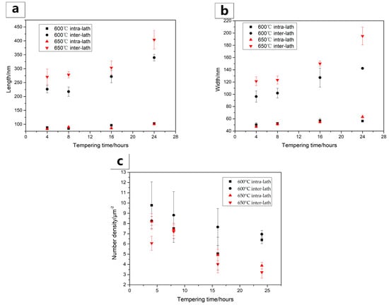 Inter- and intra- lath carbides both coarsen and spheroidize during tempering; Figure 4 shows the inter- and intra-lath carbide size and number density variations for tempering at different temperatures. The sizes for inter-lath carbides are obviously larger than those for intra-lath carbides in Dievar steel, due to the faster solute lath/grain boundary diffusion [32]. It has also been shown that the size of inter-lath carbides increases noticeably with increasing tempering temperatures, e.g., from 600 °C and 650 °C (see Figure 4a). However, the size for intra-lath carbide keeps constant with increasing tempering temperatures (see Figure 4b), probably due to the newly precipitated alloy carbides replacing the previous larger particles. The carbide number density decreases with tempering time, due to the occurrence of carbide coarsening (see Figure 4c).