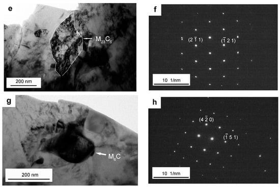 TEM images showing the presence of different alloy carbides tempered at 600 °C: (a) the morphology of M8C7 carbide (existing from 4 h to 24 h); (b) the corresponding SAD pattern for the particle in (a) consistent with the [0 −3 9] zone axis of M8C7; (c) the morphology of M7C3 carbide (existing from 4 h to 24 h); (d) the corresponding SAD pattern for the particle in (c) consistent with the [−4 5 −1 0] zone axis of M7C3; (e) the morphology of M23C6 carbide (existing from 16 h to 24 h); (f) the corresponding SAD pattern for the particle in (e) consistent with the [−1 −1 1] zone axis of M23C6; (g) the morphology of M6C carbide (solely existing for 24 h); (h) the corresponding SAD pattern for the particle in (g) consistent with the [−1 −2 9] zone axis of M6C.