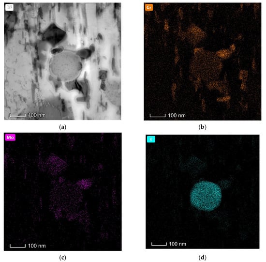 STEM EDS-mapping on different carbides precipitated upon tempering Dievar steel for 24 h: (a) The bright field image showing the existence of spherical, faceted, and rod-shaped carbides; (b–d) Elemental mapping.