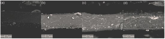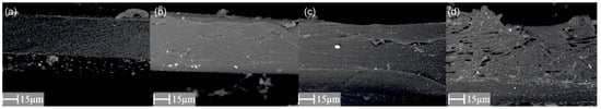 SEM image of membrane cross section with ZIF-8 added; (a) PEBAX 2533 + 0 wt% ZIF-8, (b) PEBAX 2533 + 2 wt% ZIF-8, (c) PEBAX 2533 + 5 wt% ZIF-8, (d) PEBAX 2533 + 10 wt% ZIF-8.