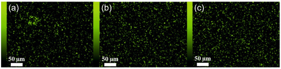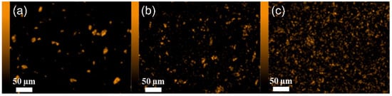 Surface of membranes containing POSS-Ph. Mapped Si; (a) PEBAX 2533 + 0.75 wt% POSS-Ph, (b) PEBAX 2533 + 2 wt% POSS-Ph, (c) PEBAX 2533 + 8 wt% POSS-Ph.