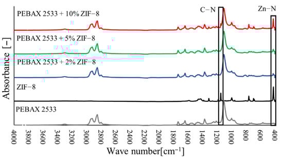 FTIR analysis of membranes containing ZIF-8 in different concentrations.