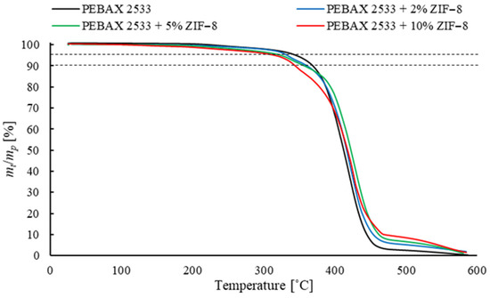 TGA analysis of membranes containing ZIF-8 in different concentrations.