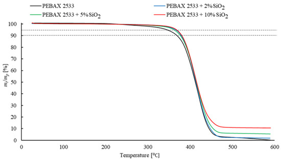 Thermogravimetric analysis (TGA) was used to investigate the presence of the solvent and water in the structure of the membrane once it was produced. This method also examines the influence of an inorganic filler on the thermal stability of the sample. We found that a sample begins to lose thermal stability when it loses 5 wt% of its initial weight, and a complete loss of stability is recorded with a loss of 10 wt% of the initial sample weight. Therefore, the temperatures at which the weight loss was 5 wt% and 10 wt% were measured. TGA analysis was performed using TGA/DSC 3+ (Mettler Toledo, Columbus, OH, USA). The samples were analyzed in an argon atmosphere within the temperature range 25 °C to 600 °C at a heating rate of 10 °C/min. The weight of the sample was 10 mg.