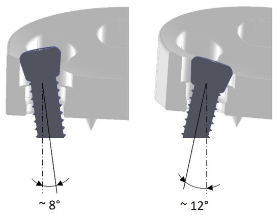 Particular attention was paid to the design of the fixing holes. The exact geometry of these holes is important to ensure that the screw heads are held securely and that the screw heads do not project beyond the implant surface. The implant or the fixing holes were designed for the use of osteosynthesis screws “Locking Screw 3.5 mm” from the Small Fragment Locking Compression Plate (LCP) System (DePuy Synthes Companies, Zuchwil, Switzerland, and Warsaw, IN, USA, https://www.jnjmedicaldevices.com/en-EMEA/companies/depuy-synthes, accessed on 8 July 2022). The screws can be introduced in multiple directions, i.e., at different angles to each other, in order to adapt to the respective anatomical situations and to increase the mechanical stability of the fixation (Figure 3).