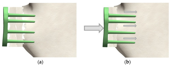 Fixation of the implant was assumed with four screws. The posterior implant surface was assumed without bone support, so the implant is only held in place by the screws. Thus, the determined displacement (corresponds to “deflection”) of the implant can act as a stimulus on the augmentation. At the simulation model for the dynamic variant, the joint ball is resting eccentrically on the implant. The fixation of the implant was assumed at the end of the conical pins. The eccentric loading and clamping of the pin ends result in a displacement and thus a (rotational) moment at the connection points of the pins with the implant main body. This in turn represents the load situation that occurs when the implant is attached to the bone via the pins and “tilts” the implant surface away due to an eccentric load (with corresponding movement of the shoulder).