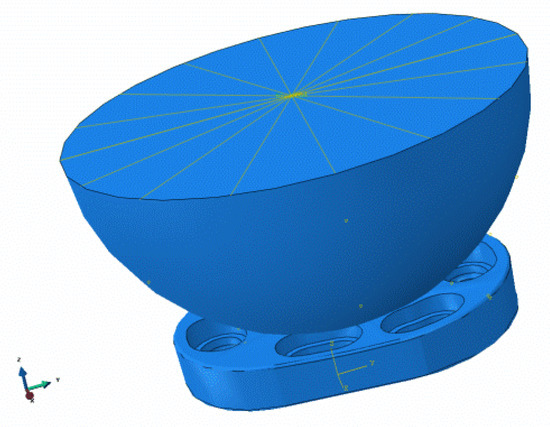 The load and force assumptions for the simulation were selected by Westerhoff and Bergmann [48] according to the measurements at the Julius Wolff Institute. For the FEM analysis, the data set “Lifting a weight of 10 kg” was used, since the measurement results here show the highest values. The data give a maximum value of 1500 N for the force acting normally on the implant surface. After consultation with shoulder surgeons, a maximum realistic force of 500 N is to be assumed for the intended application. The simulation was performed with 1500 N as well as with 500 N. In the FEM simulation, static forces/loads are applied and the resulting stresses, displacements (elastic) or plastic deformations are determined. For this purpose, a so-called substitute model must be created, which represents a section of the entire situation, reflecting the relevant force application. For the calculation of the stresses in the protective implant, the replacement model was in the form of a hemisphere representing the humeral head with an equally distributed load application.