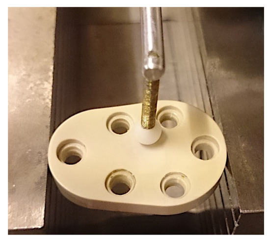 The dynamic implant variant with the conical spikes for fixation, which allow the implant to sink, was also fixed in a test block. This test block has a convex surface and parallel holes to accommodate the fixing pins; see Figure 11.