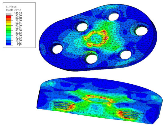 The simulation with a load of 1500 N resulted in peak strain values well above 100 MPa. This would mean that the implant would no longer be able to withstand the load. The high stresses occur again in isolated areas and could occur due to the modeling (clamping only at the tip of the conical pins would distribute the dissipation of forces along the pins).