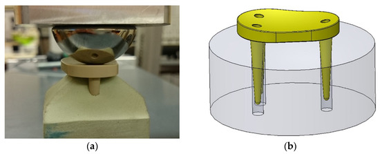For the simulation of the rigid version, a joint ball made of stainless steel, with a diameter of 48 mm, and its support centered on the implant was modelled (Figure 6).