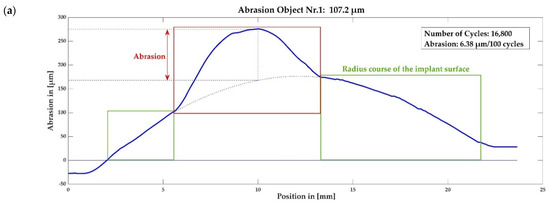 The position along the implant surface (geometric longitudinal axis) is plotted on the x-axis and the deflection (normal distance) of the galvo scanner measuring tip is plotted on the y-axis. The y-axis thus represents the measured abrasion. A standardized abrasion value in µm/100 cycles is exhibited for each object. Sudden, strongly deviating signals correspond to depressions in the surface and are a direct measure of the abrasion occurring at this point.