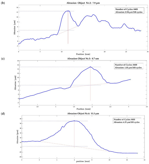 The summary of all abrasion measurement results is shown in Figure 12a–d. The different diagrams show the measurement curves of test objects 1–4 (compare Table 2). Figure 12a contains additional descriptive elements.