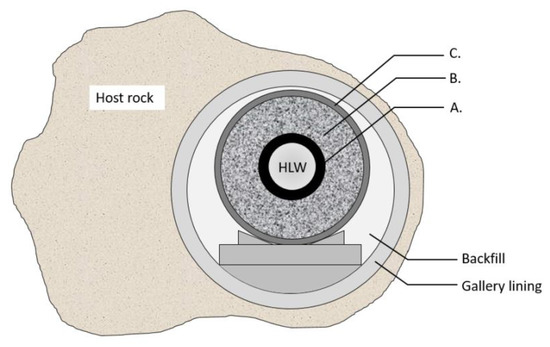 Currently, geological disposal is internationally accepted to be the most promising option for the long-term management of high-level and/or long-lived radioactive waste (HLW). To ensure a proper sequestration of the waste, a stable geological formation is required to serve as a natural barrier. In Belgium, clay formations are favored [1,2] because of their lower water permeability, limited diffusivity and absence of preferential migration pathways for solutes. Apart from this natural barrier, the disposal system includes multiple engineered barriers: radioactive waste containers are placed in concrete shafts (galleries) in the underground facility, and the container itself (containing vitrified radioactive waste or spent fuel assemblies) consists of multiple material layers. All recommendations from the Contained Environment Concept (CEC) and even earlier designs of the Engineered Barrier System (EBS) have been addressed in the current reference design of the supercontainer (Figure 1) [3]. It consists of a carbon steel inner pack (overpack) containing the waste canister (A), surrounded by a buffer (B) and a stainless steel envelope as the outer layer (C) [4]. The intention of the CEC is to achieve and preserve a durable (long-term) favorable chemical environment in the immediate vicinity of the overpack, at least for the duration of the thermal phase (several hundred to thousands of years). Portland Cement-based concrete has hence been chosen as the material for the buffer to provide a highly alkaline chemical environment, in which the external surface of the overpack will be passivated. The main function of the envelope is preventing the infiltration of pore water from the host rock through the concrete galleries into the concrete buffer. Therefore, the envelope should have high pitting resistance, but even more importantly, a low uniform corrosion rate when it is in contact with this pore water that contains chlorides, sulfides and thiosulfates (originated from the clay host formation). Such contaminants are considerably aggressive to stainless steels and nickel-based alloys [5,6,7,8,9,10,11,12,13,14,15,16]. The concrete barriers of the disposal facility create alkaline conditions ensuring good passivation of the envelope, while elevated temperatures are expected because of the remaining heat dissipation from the nuclear waste [2]. Apart from the corrosion resistance in this harsh environment, the envelope should provide mechanical strength to ensure the reliability and possible retrievability of the supercontainer. The retrievability determines the possibility to retrieve the waste containers after they have been disposed in the repository in case the repository does not perform according to the expectations.