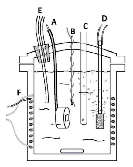 Setup of the electrochemical cell with (A) the working electrode; (B) the counter electrode; (C) the reference electrode; (D) gas bubbler; (E) gas outlet; and (F) electrical heating.