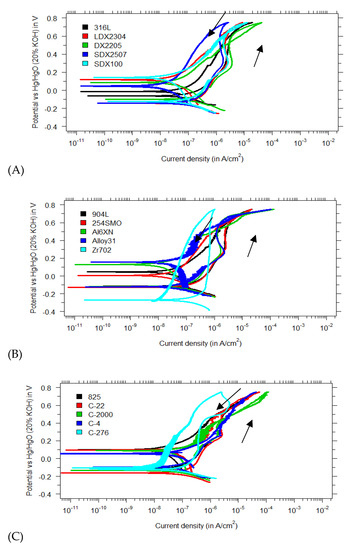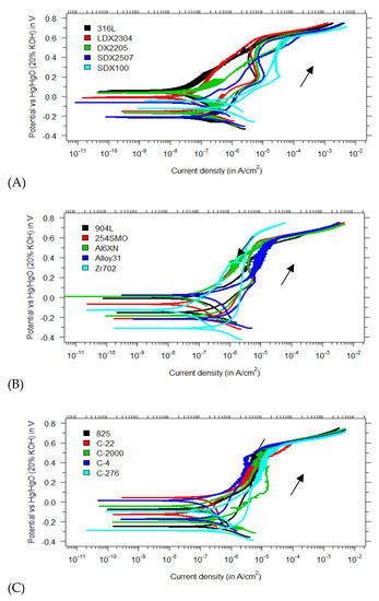 Polarization curves in a KOH/NaOH mixture (pH 13.5) with 1 M Cl− for (A) regular, duplex and super duplex stainless steels; (B) superaustenitics and zirconium-based alloys; and (C) nickel—based alloys.