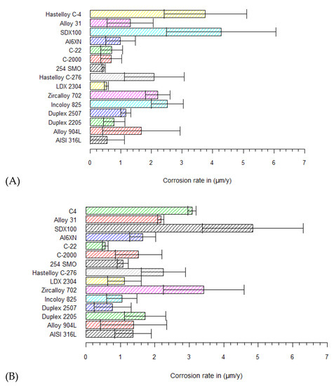 In saturated Ca(OH)2 with a high chloride content (1 M Cl−), five materials showed different statistical p-values in combination with other grades according to the Dunn test (Table 3). Superaustenitic 254SMO, Hastelloy C-2000 and C-22, austenitic 316L and lean duplex 2304 stainless steel are found in several combinations with a p-value < 0.025. Interestingly, these five grades had a surprisingly low corrosion rate in saturated Ca(OH)2, as reported in Figure 5A. Superaustenitic 254SMO compared to Hastelloy C-276 had a corresponding p-value of 0.009, which is significant. It is apparent from Figure 5A that the uniform rate of 254SMO is lower than that of Hastelloy C-276. Even when taking into account the standard deviation, their difference is statistically significant using the Dunn test. For all the other significant p-values (and combinations), the same methodology was used for interpretation. 254SMO shows better resistance to uniform corrosion than Hastelloy C-4, Alloy 825, Zr702 and super duplex SDX100. The other four grades (i.e., Hastelloy C-22, Hastelloy C-2000, AISI 316L, LDX2304) showed similar behaviors to the tested 254SMO, and also have multiple comparisons with p-values <0.025.