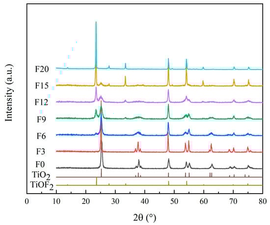Hydrofluoric acid (0, 3, 6, 9, 12, 15, and 20 mL) was slowly dropped into 51 mL butyl titanate at a rate of 2–3 drops per second, and then 90 mL CH3COOH was slowly added at the same rate, the precursors were then separated and dispersed using a cell fragmentation apparatus (Ningbo, Zhejiang Province, China. Xinzhi Biotechnology Co., Ltd., SCIENTZ-IID, 65 Hibiscus Road, Ningbo National High-tech Zone.). The mixed solution was stirred at a constant speed for 30 min at room temperature and then transferred to a stainless-steel reactor containing a Teflon liner and reacted at 180 °C for 15 h under high pressure. After cooling to room temperature, the product was cross-washed with ultrapure water and absolute ethanol three times, dried in a 60 °C air drying oven, and then ground. The product was abbreviated as FX, namely, F0, F3, F6, F9, F12, F15, and F20.