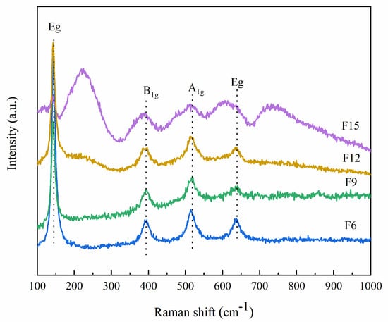 Anatase TiO2 Raman spectra have six bands: their frequencies are A1g (ν = 514 cm−1), B1g (ν = 402 cm−1 and 522 cm−1) and Eg (ν = 144 cm−1, 197 cm−1 and 635 cm−1). Anatase is teteal and the space group is I41/AMD (D19/4H); thus, the bands ν = 197 cm−1 and 522 cm−1 are the weakest []. Figure 3 shows the Raman diagram of the prepared materials. F6, F9, F12, and F15 all contain TiO2 bands. By comparison, Hou et al. [] found that the Raman spectra of TiOF2 are at ν = 230 cm−1 and 750 cm−1. Figure 1 shows that the increase in HF content causes the Raman spectrum of TiOF2 to become gradually obvious. In particular, F12 and F15 have a better Raman spectrum of TiOF2. This is because the Raman spectrum of TiOF2 is weaker than TiO2, and its characteristic spectrum cannot be displayed when the content is not high enough.