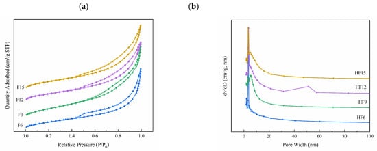 Figure 4 shows the N2 adsorption–desorption curve of the prepared photocatalytic materials and the corresponding pore size distribution of BJH. Figure 4a shows that FX has a typical type IV N2 adsorption curve and H3 hysteresis regression curve, thus indicating that the catalyst has a mesoporous structure []. The pore size distribution in Figure 4b shows that the main pore size distribution of the composite catalyst is within 10 nm, thus indicating that the particle size distribution of the catalyst is narrow. The results of specific surface area and pores of the catalyst calculated by the BJH method are shown in Table 2, respectively. F15 has the largest specific surface area of 60.89 m2/g, and there is little difference between pore volume and diameter.