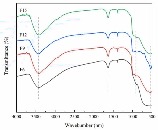 The surface groups of FX were further confirmed by infrared spectroscopy, and the results are shown in Figure 5. The absorption bands centered at 3429 and 1633 cm−1 are caused by hydroxyl radicals and related hydrogen bonds and absorption of water []. The absorption band at 922 cm−1 was caused by the vibration of Ti–F in TiOF2, thus indicating that the F atom replaced part of the oxygen atom in TiO2 []. The absorption peaks around 500 cm−1 are due to the stretching vibration of the Ti–O group [].