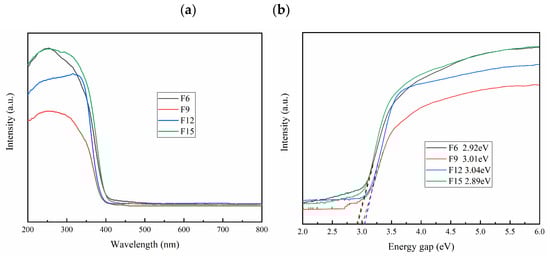 The UV-vis absorption diagram of FX is shown in Figure 6a. F15 and F6 have the strongest peak in the range of 200–400 nm, thus indicating that it has good absorption of UV. The redshift ability of F15 and F6 is stronger than that of F12 and F15 in the visible region, thus indicating that the utilization rate of light of F15 and F6 is improved, and the ratio between {001} TiO2 and TiOF2 affects the light absorption performance of the material. The band gap energy (Eg) of the semiconductor is calculated by the Kubelka–Munk function []. Combined with Figure 6b, we conclude that F15 has the smallest band gap of 2.89 eV, which indicates that F15 has a narrower band gap and stronger light absorption capacity.