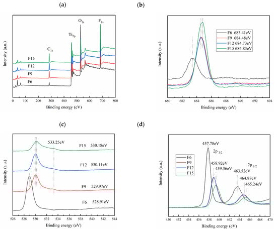 XPS is used further to explore the element composition and binding energy of FX. Figure 7a shows that the samples all contain four elements: C, Ti, O, and F. The C comes from the XPS instrument itself, and Ti, O, and F come from TiO2/TiOF2 samples []. Figure 7b shows that the F1s binding energies of F6, F9, F12, and F15 materials are 683.41, 684.48, 684.73, and 684.83 eV, respectively, and their binding energies gradually increase, thus indicating that Ti-F bond on TiO2 surface moves to Ti–F in TiOF2 lattice []. Figure 7c showed that the O1s binding energies of F6, F9, F12, and F15 materials are 528.91, 529.97, 530.11, and 530.18 eV, respectively, thus indicating that the binding energies of O1s and titanium dioxide lattice oxygen (Ti−O−Ti) increase, which may be caused by the replacement of O atoms by more F atoms []. In addition, the binding energy of O atoms appears at 533.25 eV for F9, F12, and F15, which corresponds to oxygen vacancy (Ov) and hydroxyl oxygen in adsorbed water []. Figure 7d shows that F6 and F9 (material F12) as well as F15 material Ti2p3/2 binding energies are 457.78, 458.92, and 459.36 eV, respectively; F6, F9 (≈F12), and F15 Ti2p1/2 binding energies are, respectively, 463.52, 464.87, and 465.24 eV, This indicates that the binding energy of Ti-F bond is stronger than that of Ti-O bond, indicating that TiOF2 is gradually increased in the composite []. In addition, Figure 7b–d show that the peaks of F1S of F6, F9, F12, and F15 are gradually enhanced, while the peaks of O1s and Ti2p are gradually weakened, thus further indicating that the proportion of TiOF2 in the composite materials is gradually increasing.