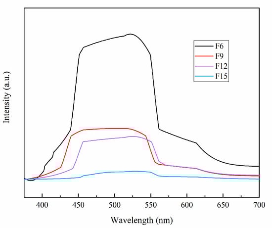 The PL spectrum can be used to study the photogenerated carriers’ recombination in semiconductors []. A higher peak intensity leads to a higher photogenerated electron–hole recombination rate and a lower photocatalytic activity. The PL spectrum of FX is shown in Figure 8, and F15 has the lowest fluorescence intensity, which indicates that the P-N heterojunction formed by n-type TiO2 and p-type TiOF2 effectively inhibits the recombination rate of electron–hole pairs and also indicates that the ratio of TiO2 and TiOF2 in {001}TiO2/TiOF2 composites is very important.