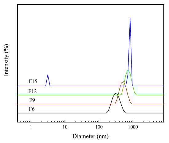 The particle size distribution of the prepared FX material is shown in Figure 9. The average particle sizes of F6, F9, F12, and F15 are 532.8, 560.8, 837.8, and 1389.0 nm, respectively. When combined with SEM images, we conclude that the average particle size of materials increased gradually as the hydrofluoric acid amount gradually increased. F6 and F9 appear similar—the average particle size is close to F12; F15 significantly increased. F15 has a very weak small peak, and it may be because it dissolves in a water sample; thus, the ultrasonic dispersal time is too long. A few were stripped off and caused a small weak peak in the figure.