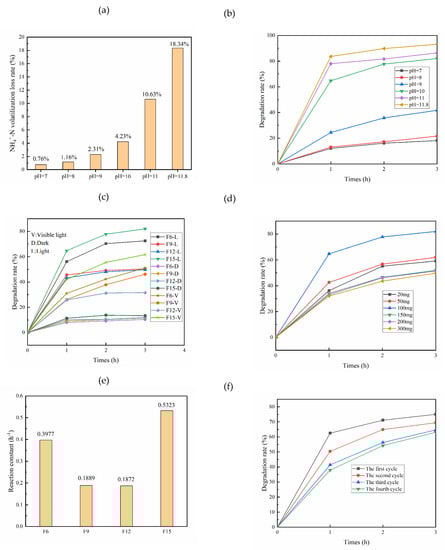 When the initial concentration of ammonia nitrogen is 100 mg/L and pH is 10, 20, 50, 100, 150, 200, and 300 mg of F15 were added to explore the influence of different dosages on ammonia nitrogen degradation (Figure 10d). The degradation rate of ammonia nitrogen with the catalyst dosing quantity decreases after first rising when the degradation of ammonia nitrogen rate is less than 100 mg. These values are lower when catalyst and ammonia nitrogen cannot fully contact. Very high catalyst dosage affects light utilization and leads to a decrease in the degradation rate.