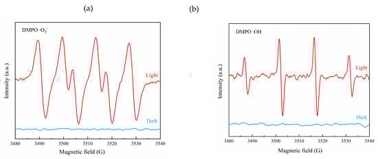 ESR was used to detect the types of free radicals under F15 light and to explore the mechanism of its degradation of ammonia nitrogen. Figure 11a,b shows that F15 did not produce free radicals in the absence of light, and hydroxyl radical (·OH) and superoxide radical (·O2−) were detected after light. Here, ·OH and ·O2− played a decisive role in the entire reaction []. The degradation mechanism is given as follows: NH4+ exists as NH3·H2O under alkaline conditions. The NH3·H2O molecules are first adsorbed on the surface of the catalyst. Electrons and holes are generated when the catalyst is exposed to light. They then oxidize water molecules on the surface of the catalyst to form ·OH, while electrons and dissolved oxygen on the surface of the catalyst are formed through a series of reactions to form ·O2−. The ·OH and ·O2− are the main active components in the photocatalytic reaction process via the following process []: