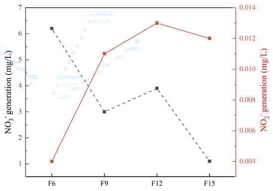 In order to further confirm the intermediate products of ammonia nitrogen degradation, the initial concentration of ammonia nitrogen was held at 100 mg/L. Next, 100 mg of F15 is added with pH 10 and a reaction time of 180 min. The results are shown in Figure 12. Here, NO3− and NO2− concentrations are no more than 6.21 and 0.013 mg/L, respectively. There are three main reaction products of ammonia nitrogen, NO3−, NO2−, and N2, the low content of NO3− and NO2− indicates that ammonia nitrogen is mainly oxidized to N2. We speculated the following on the process of photocatalytic degradation of ammonia nitrogen: One option is that a series of intermediates such as NH2, NH, and N2Hx+y (x, y = 0, 1, 2) are generated in the reaction process—they then react into nitrogen molecules. The second option is that NO2− and NO3− ions are finally generated through HONH2 intermediates. The entire reaction is given as follows []: