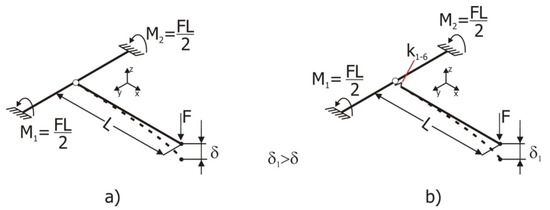 Figure 2 presents two joint schemas, where the junction of both tubular elements is rigid in its left image (a) and is flexible in the right image (b). This flexibility is represented by the introduction of stiffness k1 to k6 at the intersection point of both tubular elements. These stiffness values are experimentally pre-determined to faithfully represent real T-joints. These stiffness values do not change the dimensions of the structure in any way. The direct effect of them into the joint causes the displacement δ1 > δ in all cases.