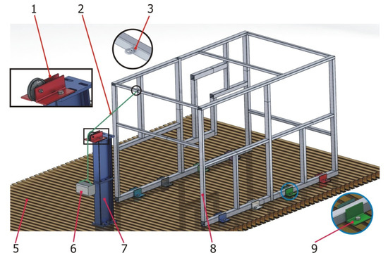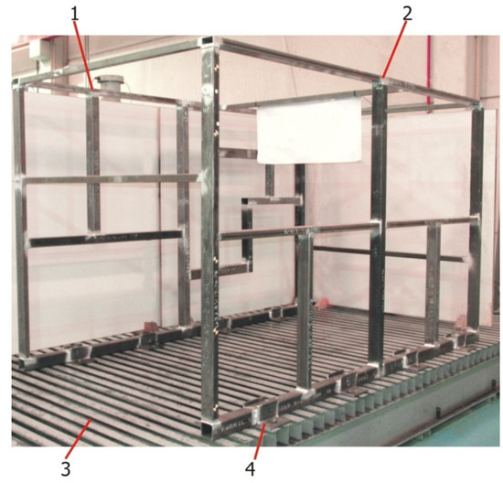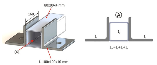 Figure 3, number 3). Additionally, a solution had to be found to properly constrain the structure during testing to avoid errors introduced by the displacement of the restriction points, since these displacements are not accounted for on virtual FEM models. To minimize these errors, 100 mm × 100 mm × 10 mm L-shaped profiles welded to the base profiles of the tubular structure (