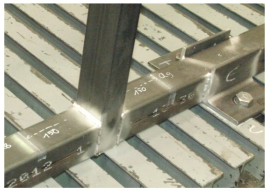 Figure 6, number 9), which were first welded to the base profiles of the validation structure and then bolted to the universal test bench with M20 bolts and threaded metal blocks.