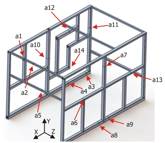 Of the 14 sections defined, in four of them (a3, a4, a8, and a9), only the displacements in the Y direction were characterized since these sections were in the base profiles of the structure in regions very close to the clamping devices, so the displacements in the other directions could be neglected. In the rest of the sections, displacements in the two most significant directions were characterized. For example, in section a1, the displacements were measured in directions X and Y, whereas in section a13, the displacements were measured in directions Z and Y.