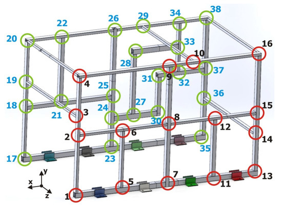 To obtain a complete and representative characterization of the validation structure, a total of 14 measuring points were defined and distributed throughout its geometry so that representative information of the global response was obtained. It was also taken into consideration the necessity to define measuring sections at different distances from the joints themselves and/or the clamping devices, so that a clearer picture of the behavior of the beam-type elements could be studied.