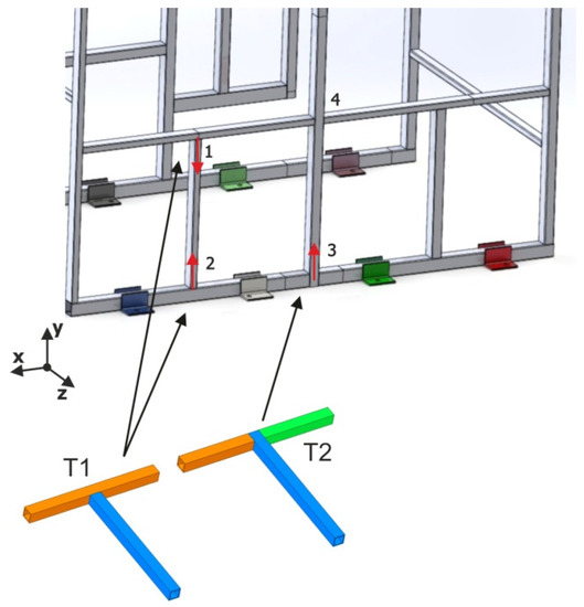 Implementing the alternative beam T-junction elements in accordance with the developed methodology requires determining the dimensional characteristics and the configuration of each of the joints (T1 or T2). A total of 38 joints were identified in the validation structure, as can be seen in the diagram presented in