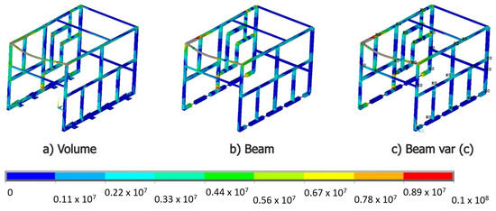 Due to the inherent limitation of beam-type elements to account for local stress raisins at the joint level, the analysis is focused on the comparison of the general stress distribution maps. The volume element type model was used as a reference for the evaluation, since this type of model, although discarded for general use due to the high computational costs that it entails, can predict stress maps with high precision.