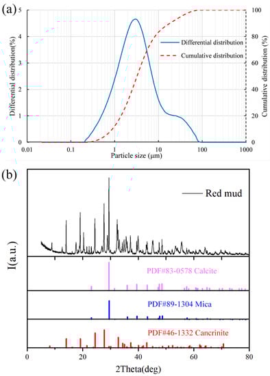 Physical and chemical properties of red mud: (a) particle size distribution of the red mud; (b) XRD of red mud.