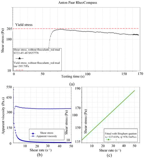 Flow curves of CPB under different shear conditions: (a) shear time vs. shear stress at constant shear rate; (b) shear rate vs. shear stress and apparent viscosity; (c) shear rate vs. shear stress fitted with Bingham equation.