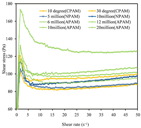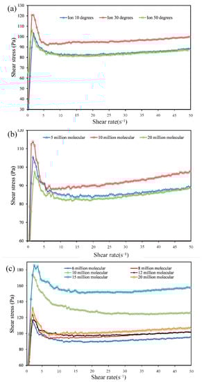 Flow curves of red mud with different ionic types: (a) cationic flocculants with different ionic degrees; (b) nonionic flocculants with different molecular weights; (c) anionic flocculants with different molecular weights.