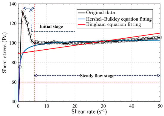The shear stress vs. shear rate curve was fitted with the Bingham equation to analyse the rheological properties of slurry by the rheometer, but the data in the initial stage of the test fluctuated so that the fitting result deviated greatly from the actual situation. The rheological properties of slurry were mainly measured by the change in shear stress in its steady flow stage rather than the initial stage. Additionally, the curve was refitted well with the Hershel–Bulkley equation, and the fitting degree of the curve was 98%. Thus, the data before slurry flow and at the beginning of the flow state are supposed to be eliminated and refitted with the Hershel–Bulkley equation to reflect the variation in shear stress with a shear rate more accurately. The Hershel–Bulkley equation is as follows: