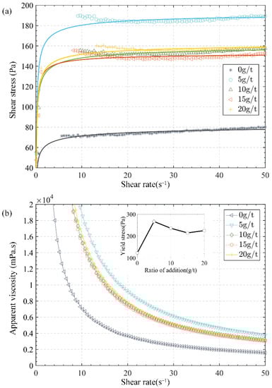 Flow curves of samples with various APAM addition: (a) shear rate vs. shear stress; (b) shear rate vs. apparent viscosity. The yield stress was presented as a function of ratio addition of APAM in the inset.