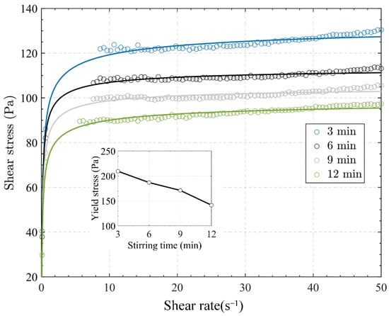 Figure 8 shows the shear and yield stresses for slurries stirred at different times, respectively. As shown, the shear stress of slurry decreased with the stirring time increasing, and the yield stress decreased from 210 to 142 Pa with the stirring time increasing from 3 to 12 min.
