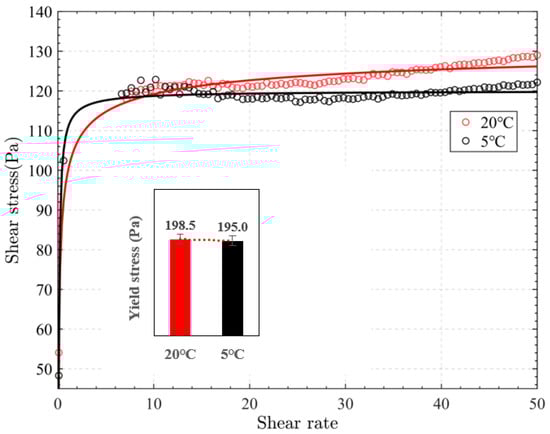 Figure 9 shows the effect of temperature on the shear stress and the yield stress of slurry. As shown, the yield stress decreased from 198.5 to 195.0 Pa, with the stirring time increasing from 3 to 12 min. It is evident that the shear stress of slurry decreased with the temperature dropping from 20 °C to 5 °C (i.e., when the temperature was low, the flocculation effect of APAM was not ideal).